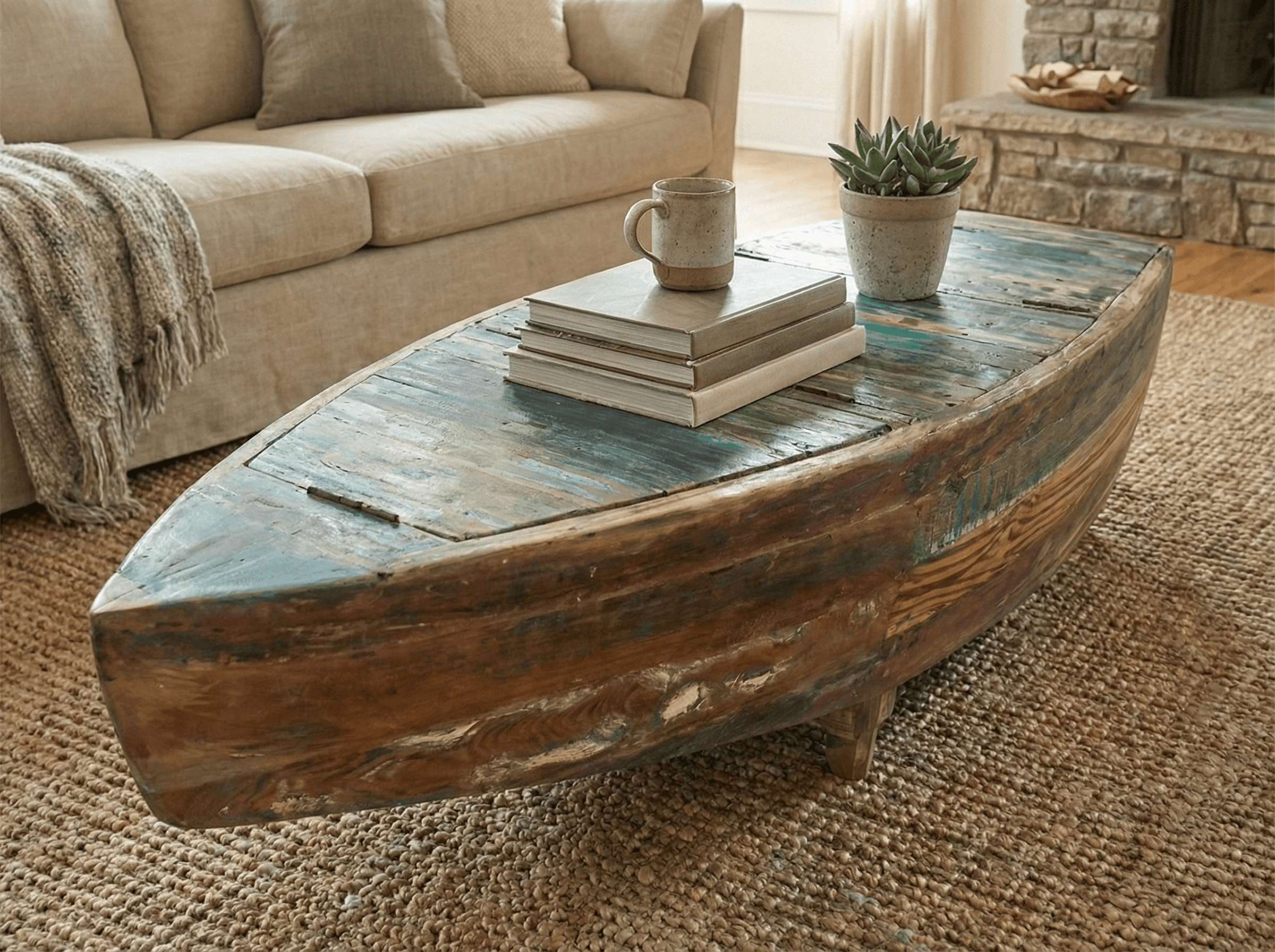 Shaped like a resting boat, Dockside Drift takes form as a coffee table designed to sit at the centre of a room.