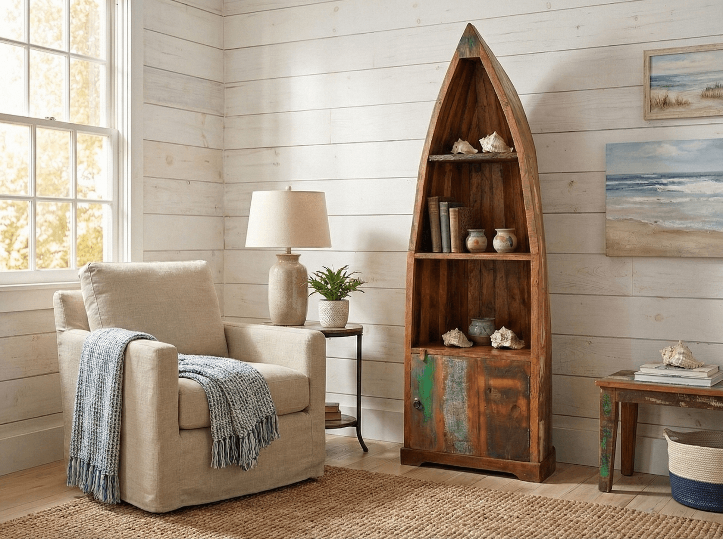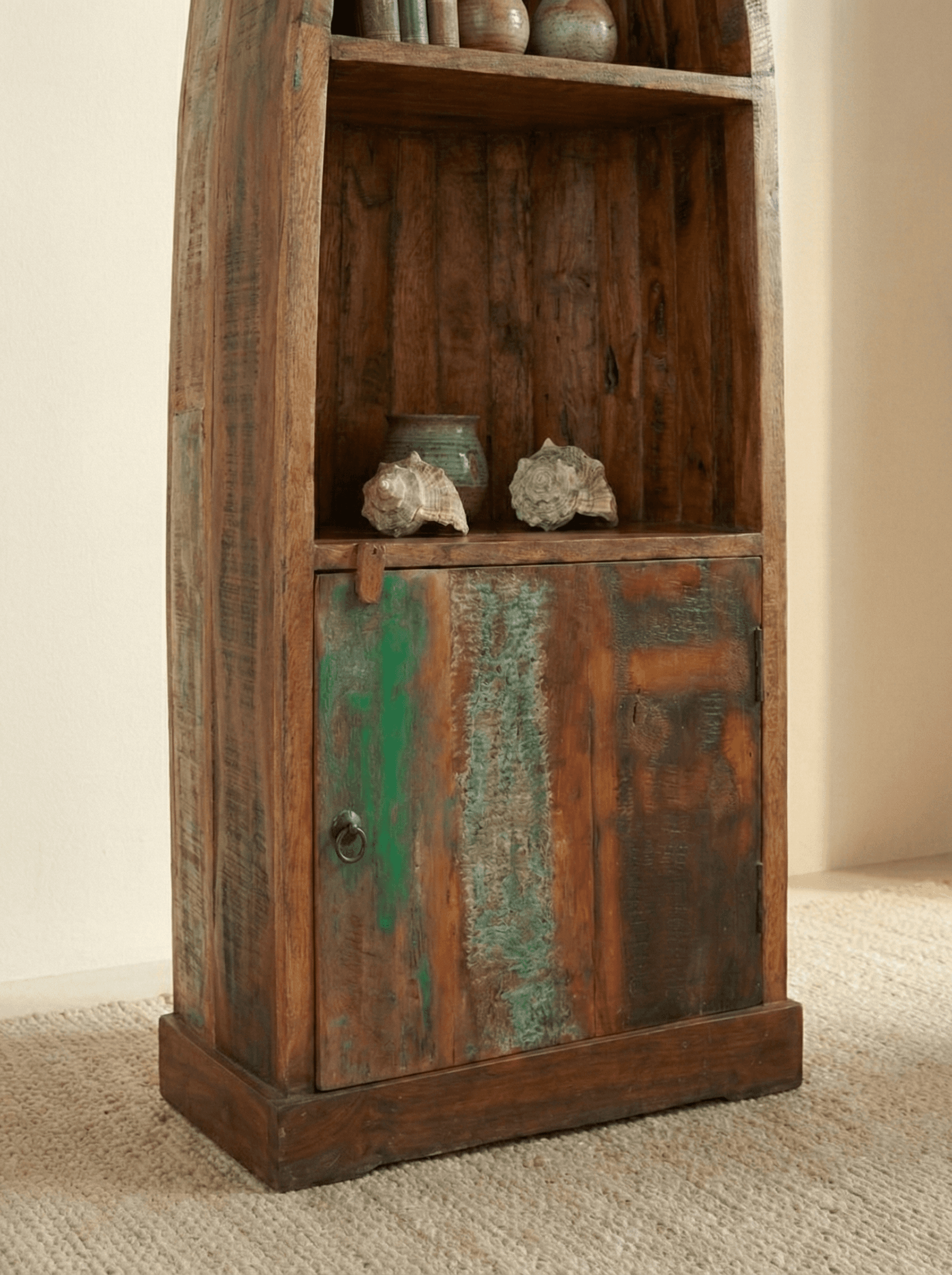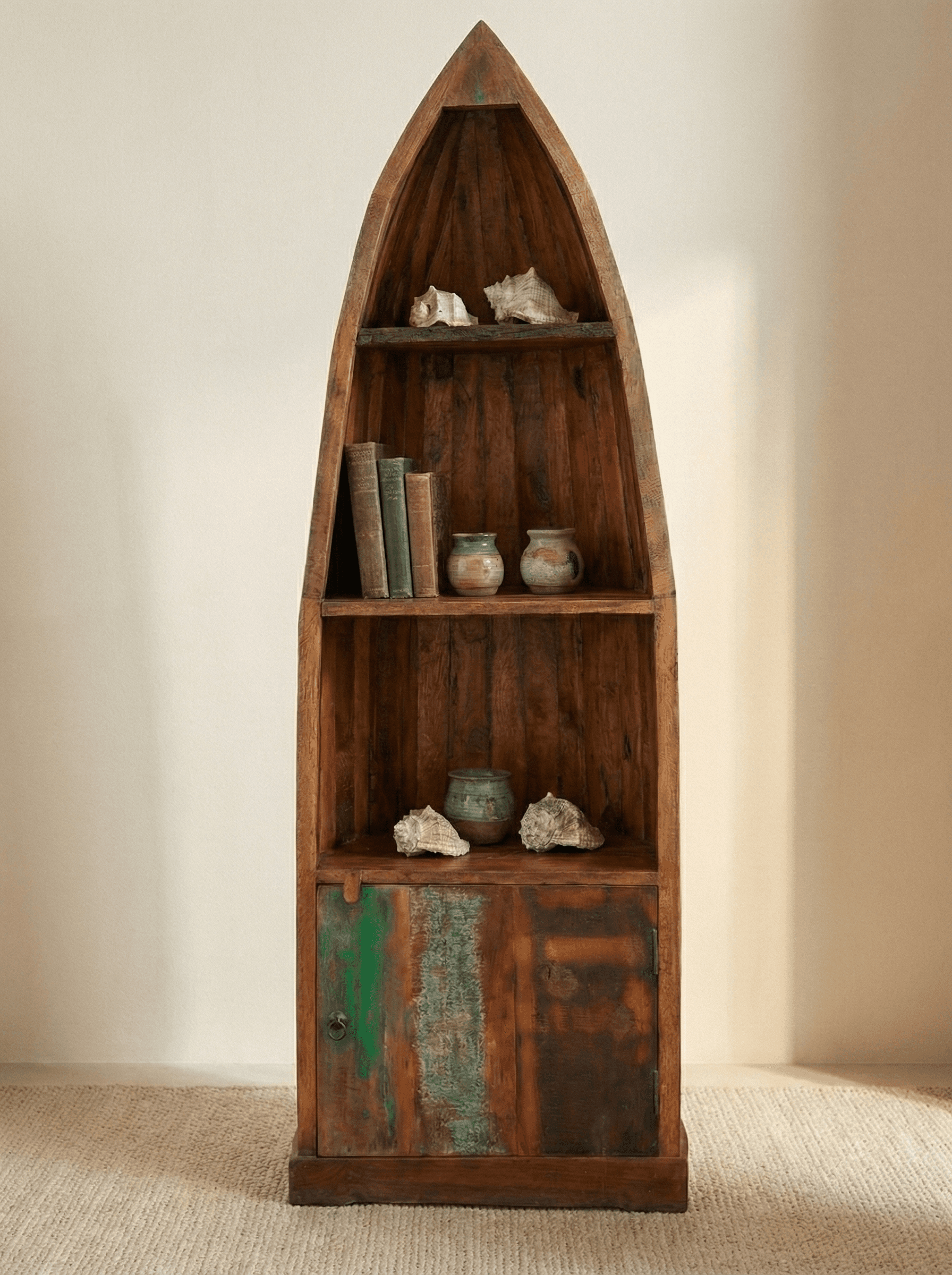 We came upon this while searching for objects that rarely belong anywhere at first, but feel extraordinary once they do, the kind you don’t find on catalogue pages. This bookshelf draws inspiration from the fishing vessels found along India’s coasts, boats that once moved with tides, monsoons, and muscle memory.